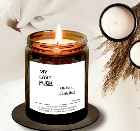 Lumanare parfumata din ceara naturala, in recipient de sticla cu capac, cadou cu eticheta mesaj amuzant - My last F**k, 150 ml.
