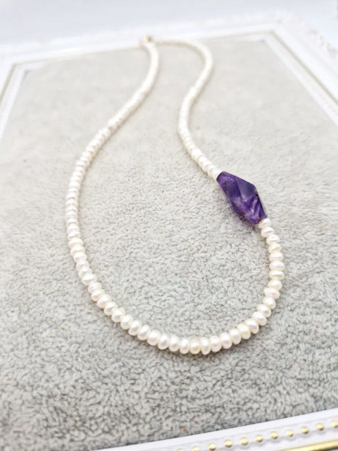 Choker (colier la baza gâtului) din perle baby naturale și ametist chevron.