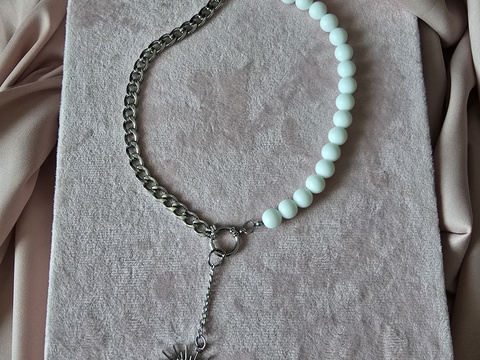 Colier din mărgele albe mate și lanț din oțel inoxidabil.