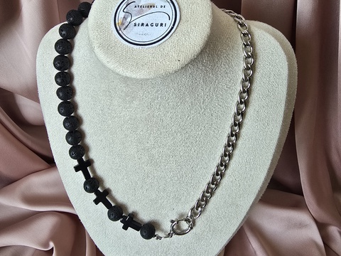 Colier din mărgele de lavă naturala, lanț din oțel inoxidabil.
