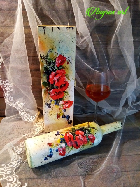 - Material: culori acrilice, hartie de orez, lac ecologic, lemn, sticla