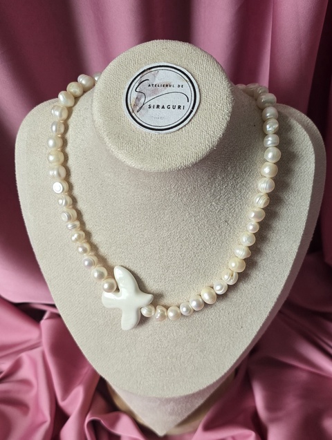 Colier de perle de cultură și pandantiv țurturică din ceramică