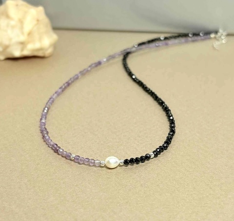 Colier din ametist, turmalina neagra si perla de cultura