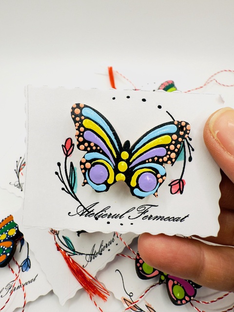 Mărțișor broșă fluture pictat manual pe lemn – tehnica punctului