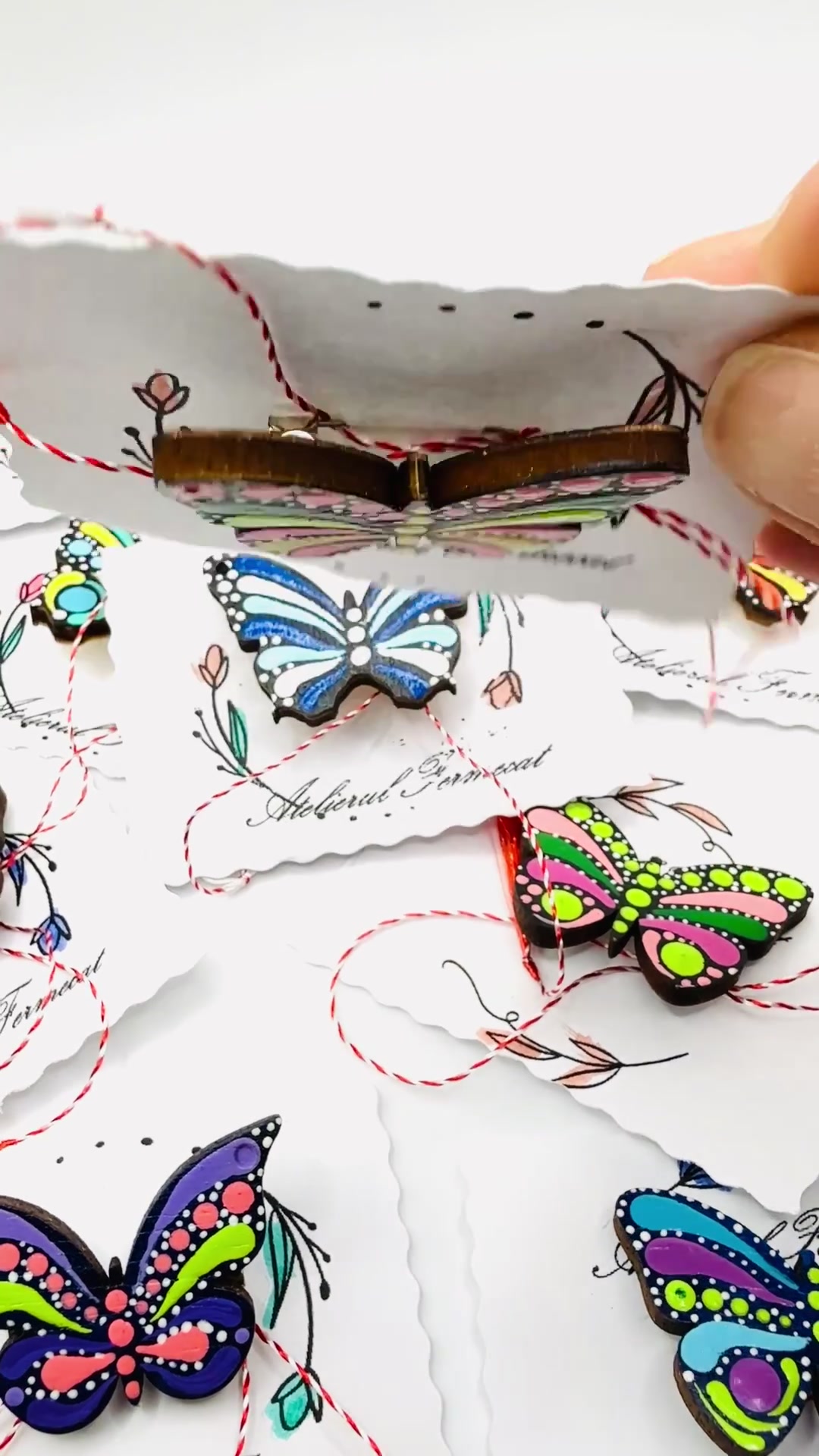 - Material: lemn, vopsea acrilica, lac lucios, ambalaj individual, snur martisor