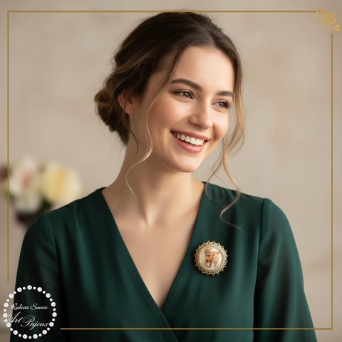 - Material: cabochon sticlă, mărgele, ac de broșă cu sistem de siguranță
