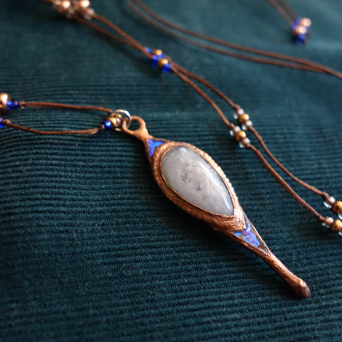 cupru, șnur cerat, mărgele sticlă, rășină poliuretanică, mărgele cupru, caboșon piatra lunii
