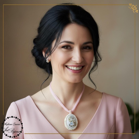 - Material: mărgele, broderie, bază organza