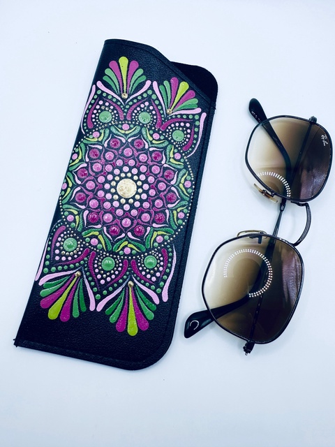 Etui ochelari pictat manual – Mandală florală roz și verde
