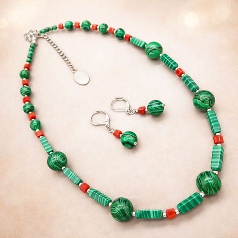 Set bijuterii handmade - malachit si sticla (cod1375)
