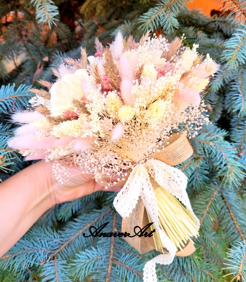 - Material: dantela, panglica yuta, plante uscate, sfoara, trandafir lemn, flori uscate, flori stabilizate
