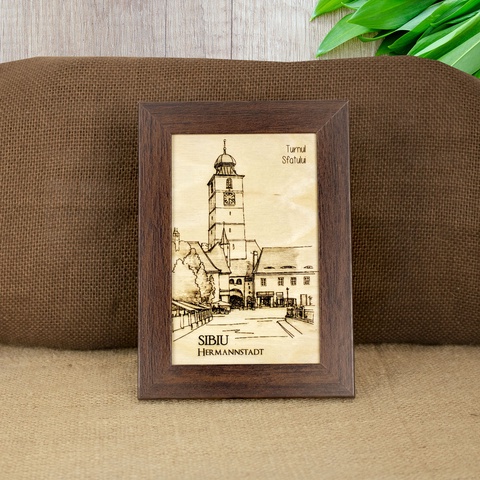 Tablou suvenir din lemn, gravat, Turnul Sfatului, Sibiu, dimensiune 10/15, rama inclusa