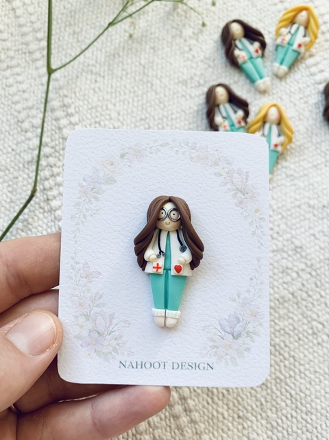 Broșă Mărțișor doctorita asistenta - par saten si ochelari