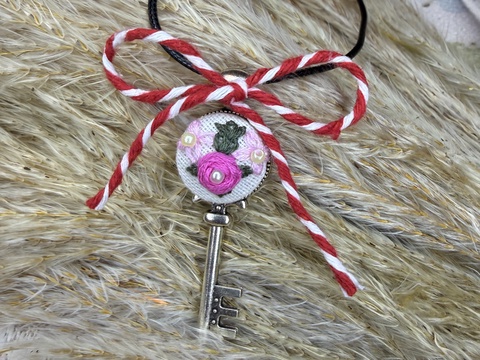 - Material: bază metal, lant metalic, cabochon sticla, panza bumbac
