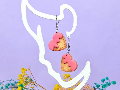 Cercei Inimă Waffle cu Căpșune – Bijuterii handmade din lut polimeric