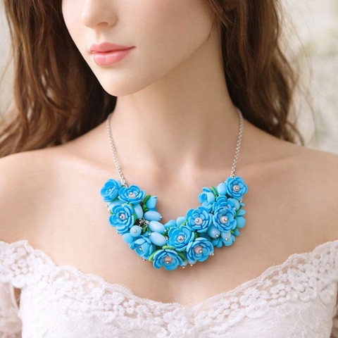 Colier handmade statement cu flori bleu - buchet floral pe lanț din inox (cod1377)