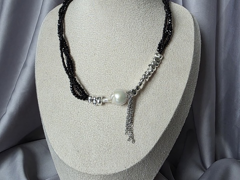 Colier din mărgele negre, hematit și perlă de cultură barocă