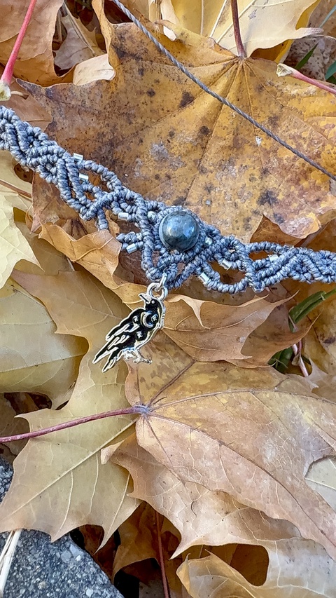 Choker din micromacramé cu labradorit natural și pandantiv corb