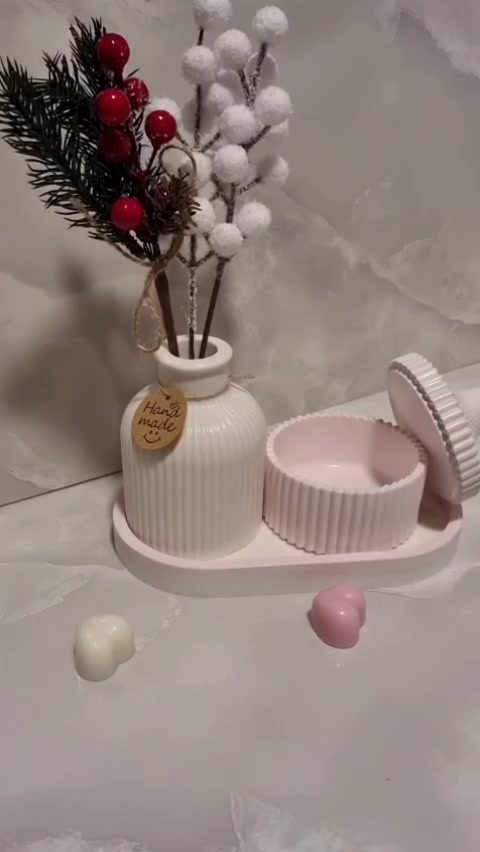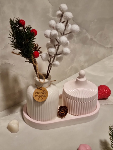 Set Decorativ Artizanal „Ribbed Elegance” – Vază și Recipient cu Capac pe Tavă Ovală