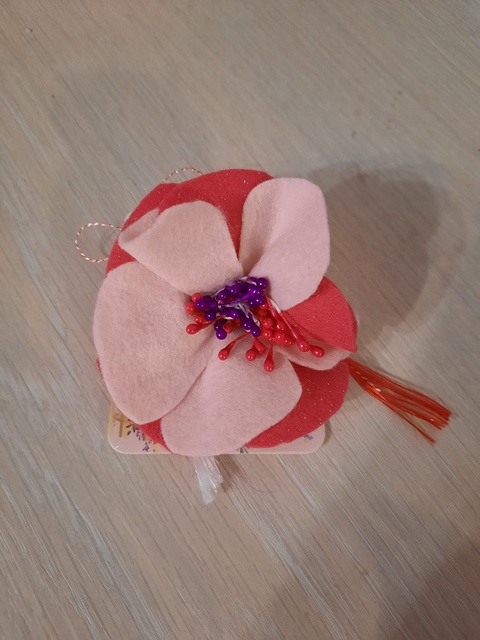 Floarea este confectionata din fetru gliterat si fetru simplu, decupata si cusuta manual, decorata cu stamine . Are ac de brosa, cartonas si ata de martisor, cutiuta si panglica decorativa. Brosa are aproximativ 8 cm.