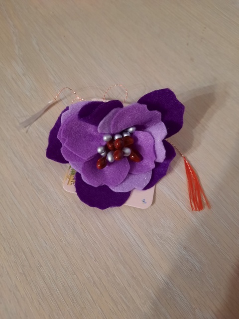 Floarea este confectionata din fetru gliterat si fetru simplu, decupata si cusuta manual, decorata cu stamine diverse . Are ac de brosa, cartonas si ata de martisor, cutiuta si panglica decorativa. Brosa are aproximativ 8 cm.