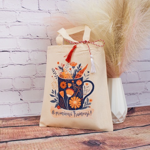 Sacoșă mărțișor textilă din bumbac, 22 × 26 cm – Cană plină cu primăvară