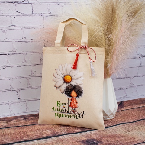 Sacoșă mărțișor textilă din bumbac, 22 × 26 cm – Fetița cu flori