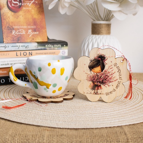 Suport de pahare din lemn, mărțișor – Fetiță cu buchet de primăvară