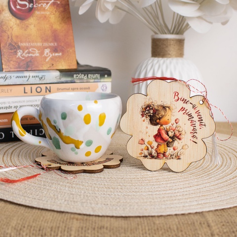 Suport de pahare din lemn, mărțișor – Fetiță cu flori în păr