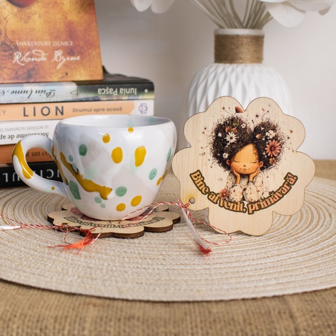 Suport de pahare din lemn, mărțișor – Fetiță cu flori