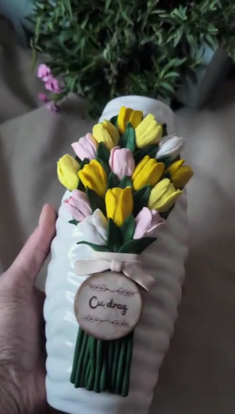 Vază decorativă handmade cu lalele din lut polimeric – personalizabilă