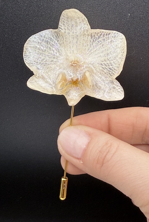 Broșă Artistică cu Floare de Orhidee Naturală Alba – Rășină UV