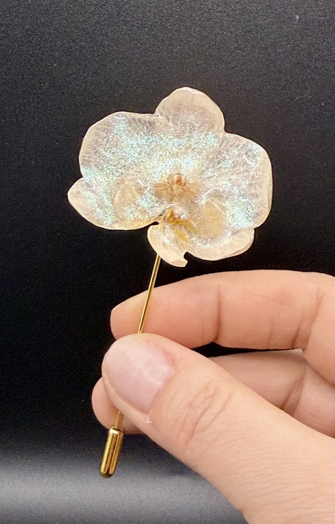 Broșă cu Orhidee alba Reală Conservată în Rășină UV