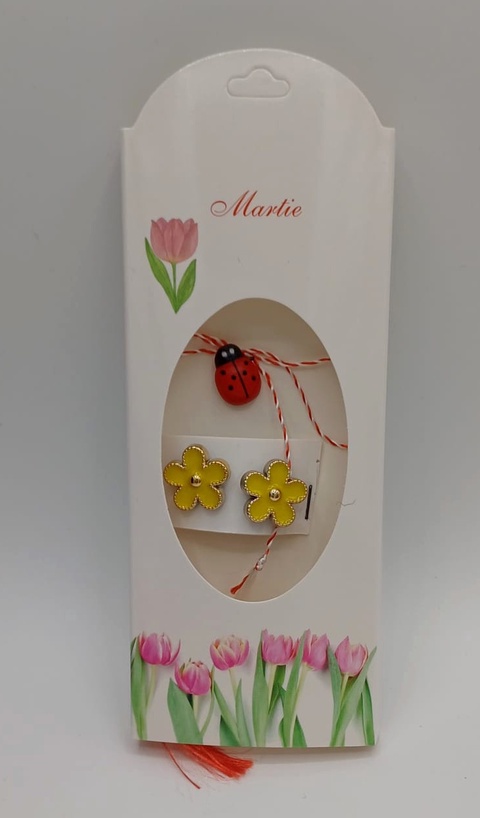 Butoni de cămașă 1 pereche tip mărțișor – floare galbenă cu buburuză ,se poarta tot anul