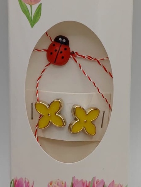 Butoni de cămașă ,1pereche tip mărțișor – floare galbenă cu buburuză,se poarta tot anul la haine