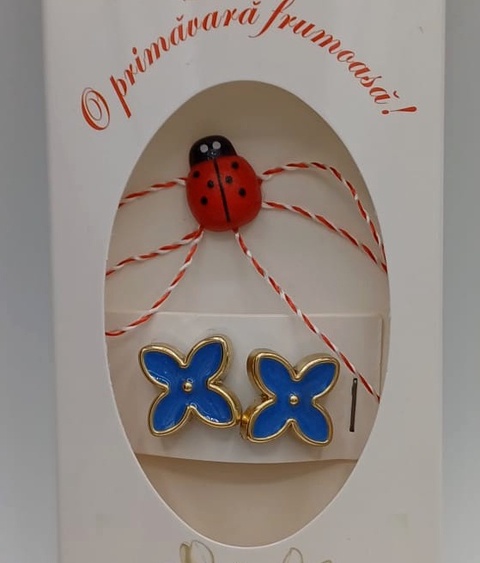 Butoni de cămașă,1 pereche,tip mărțișor – floare albastra cu buburuză,se poarta tot anul la orice tip de haina.