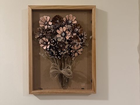 - Material: conuri de brad, lemn
