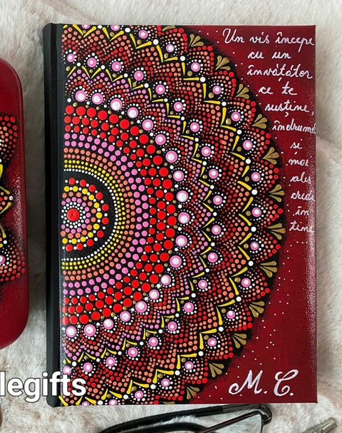 - Material: coperta piele ecologica, vopsea acrilica profesionala, lac lucios