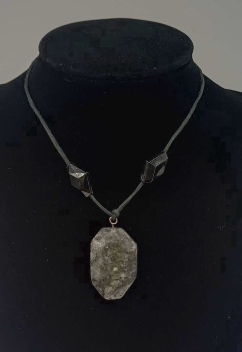 Colier artistic realizat manual, cu pandantiv din labradorit natural șlefuit, montat pe șnur din piele întoarsă de culoa