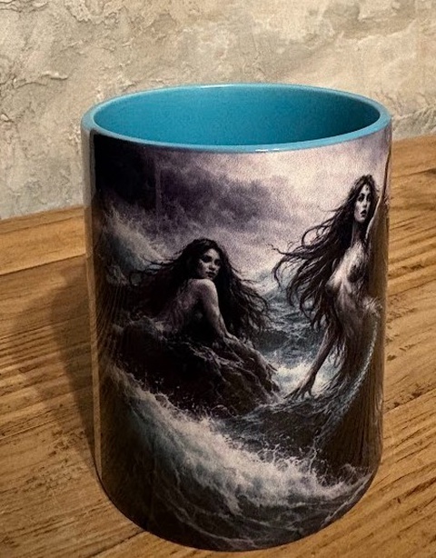 Cană ilustrată cu sirene gotice în mare furtunoasă