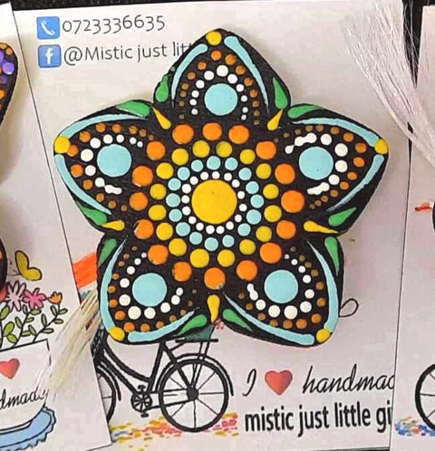 - Material: lemn, ac de brosa, pictura acrilica, snur cerat sau de piele