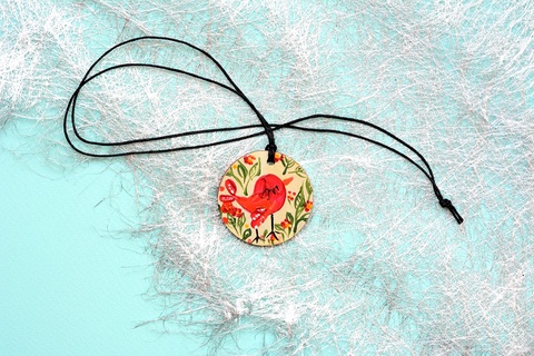 - Material: baza lemn, culori acrilice, șnur bumbac