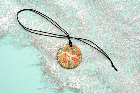 - Material: baza lemn, culori acrilice, șnur bumbac
