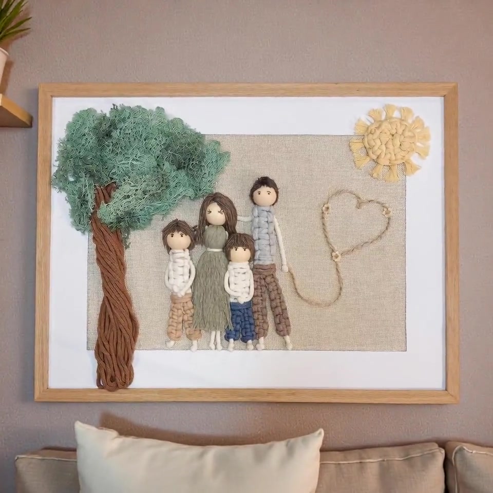 - Material: fire pentru macramé, mușchi islandez, rama pentru tablou, minge din lemn