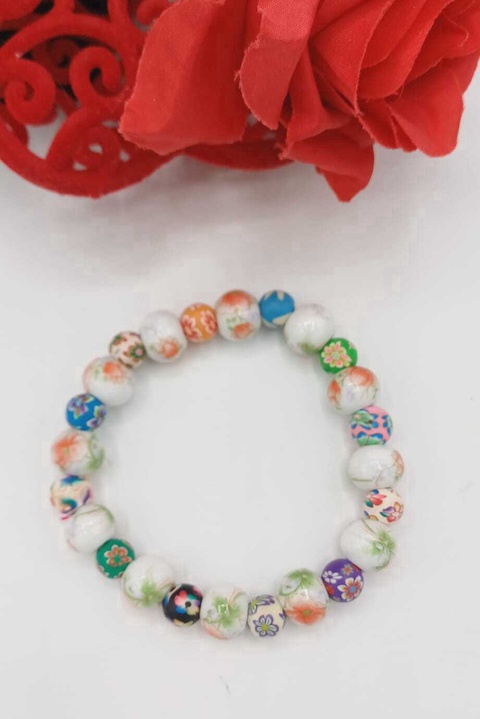 Brățară veselă cu perle florale, realizată dintr-o combinație armonioasă de perle din ceramica.