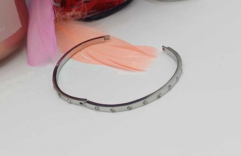 Brățară tip cuff, cu design minimalist și modern, realizată din metal argintiu