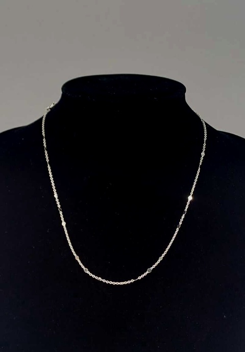 Colier delicat, minimalist, realizat din lanț metalic subțire, cu elemente decorative mici,