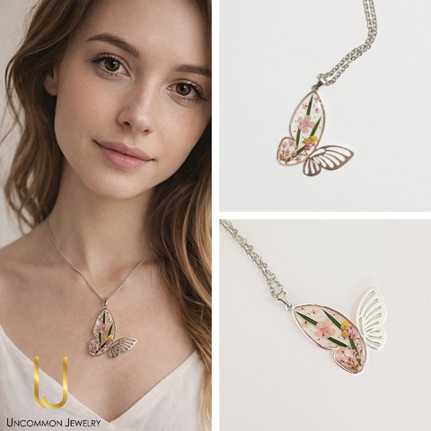 - Material: flori naturale presate, rasina, pandantiv fluture, lant argintiu