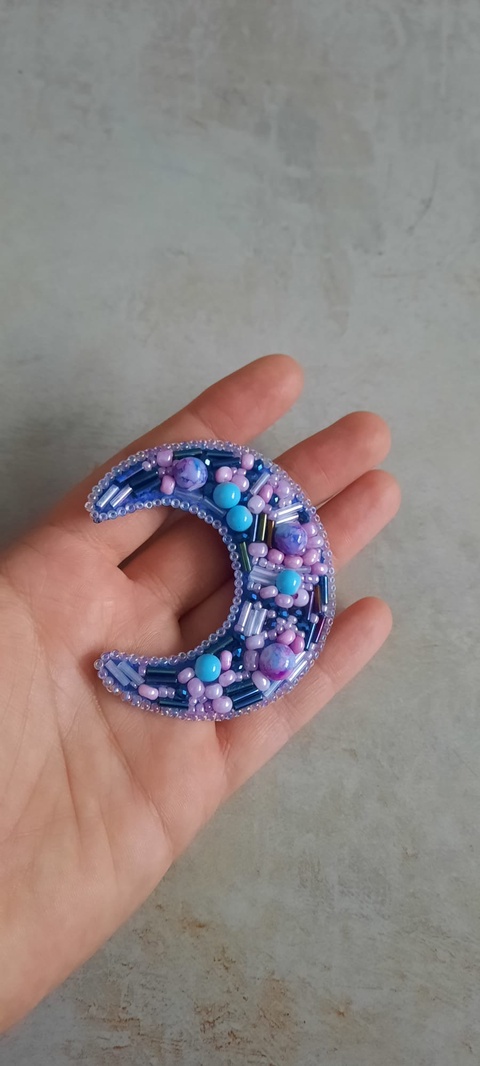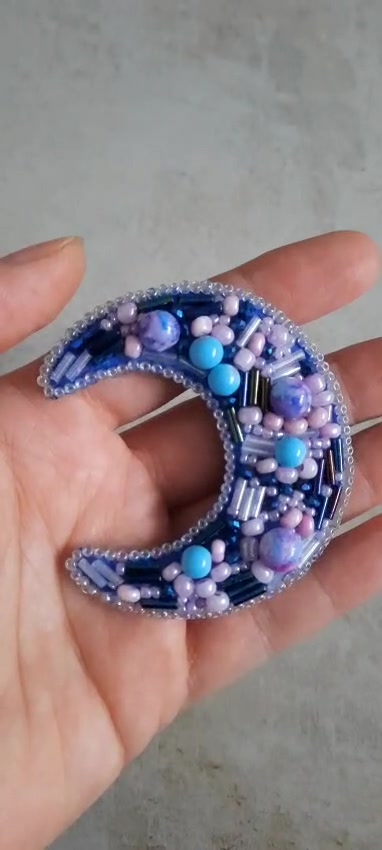 Broșă "Mystic Moon" – Semilună Brodată Manual cu Mărgele și Cristale