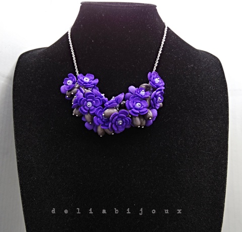 Colier handmade statement cu flori mov - buchet floral pe lanț din inox (cod1387)